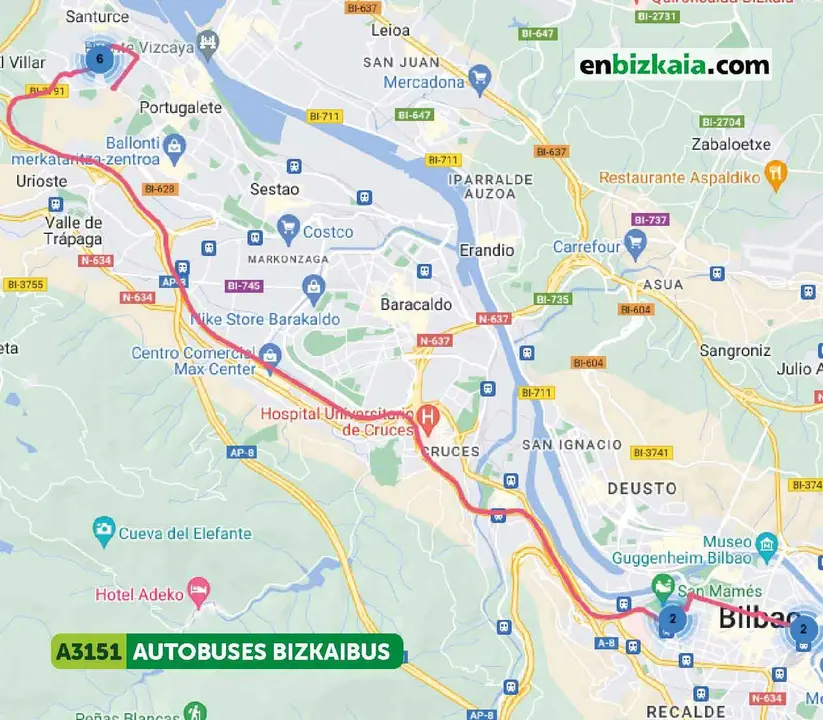 La línea de autobús Bizkaibus A3151 sale de Gran Vía 6 y termina en Buenavista. Cuenta con 10 paradas durante su largo recorrido.